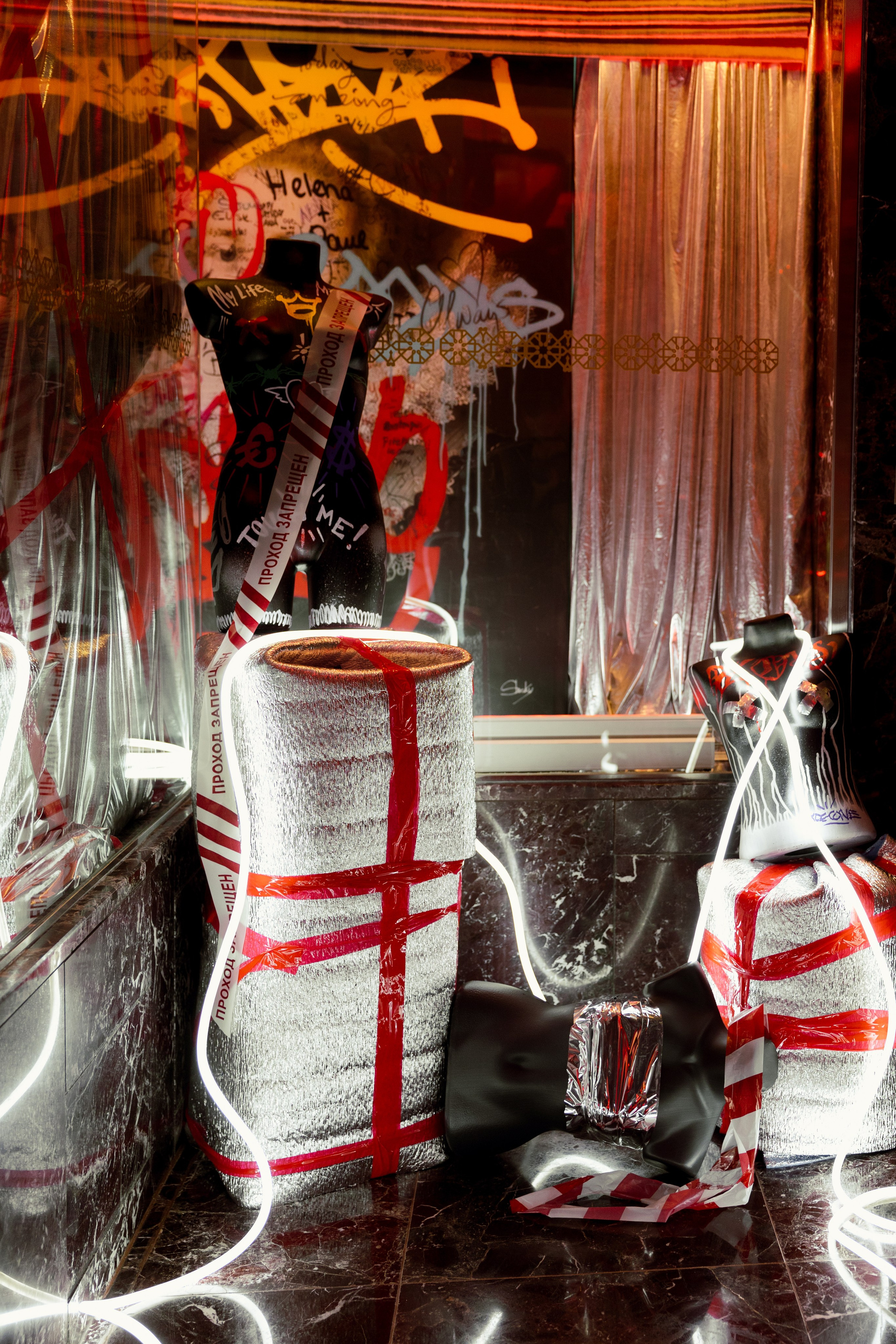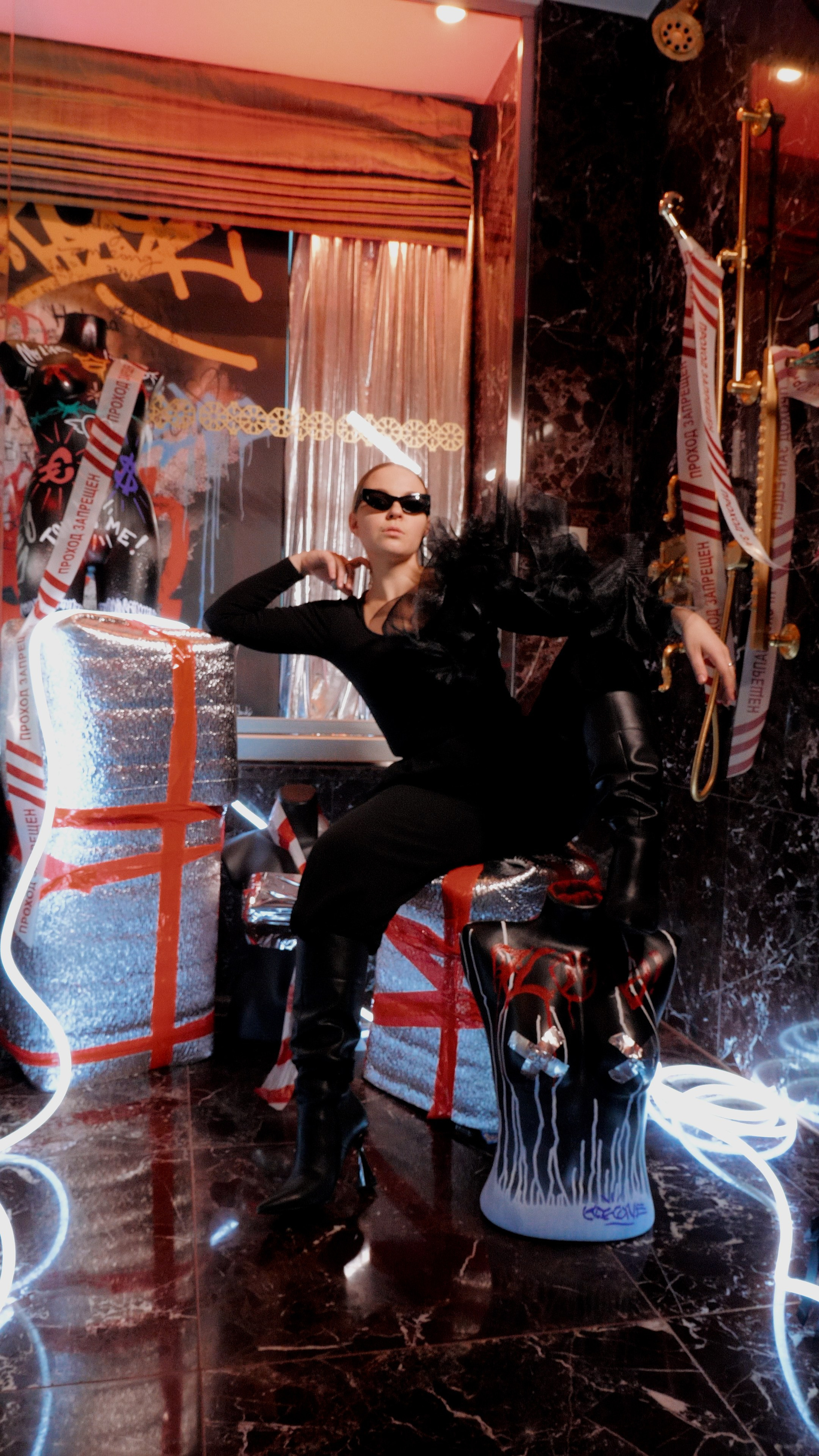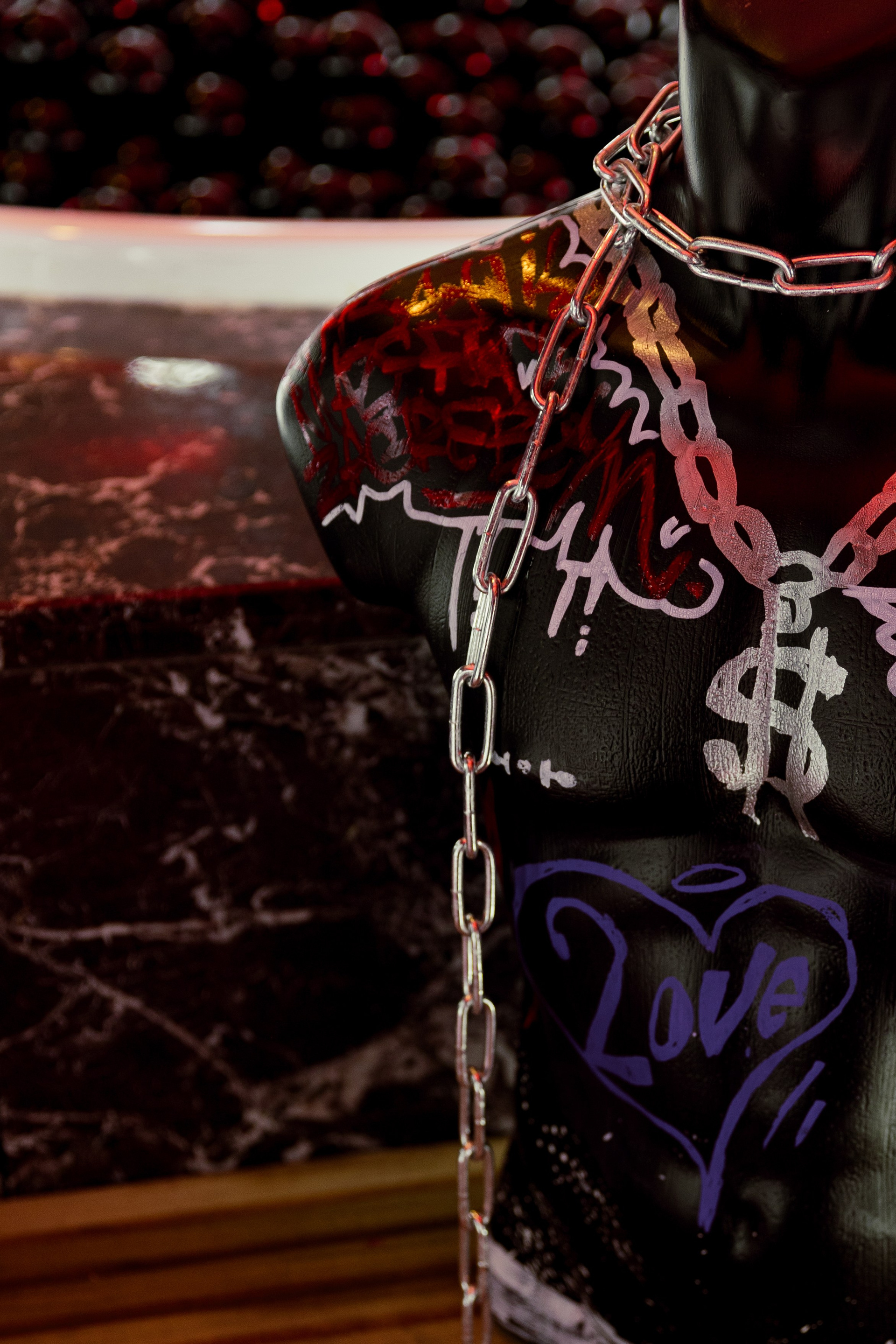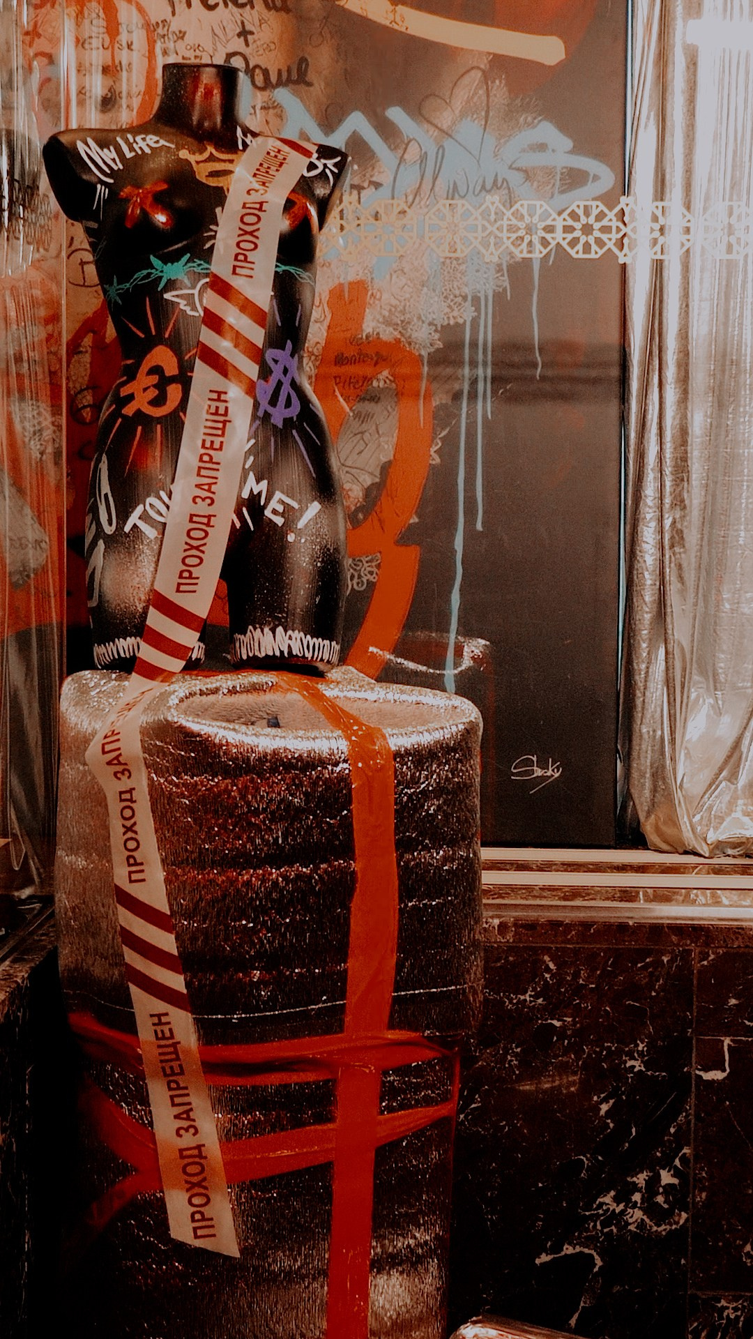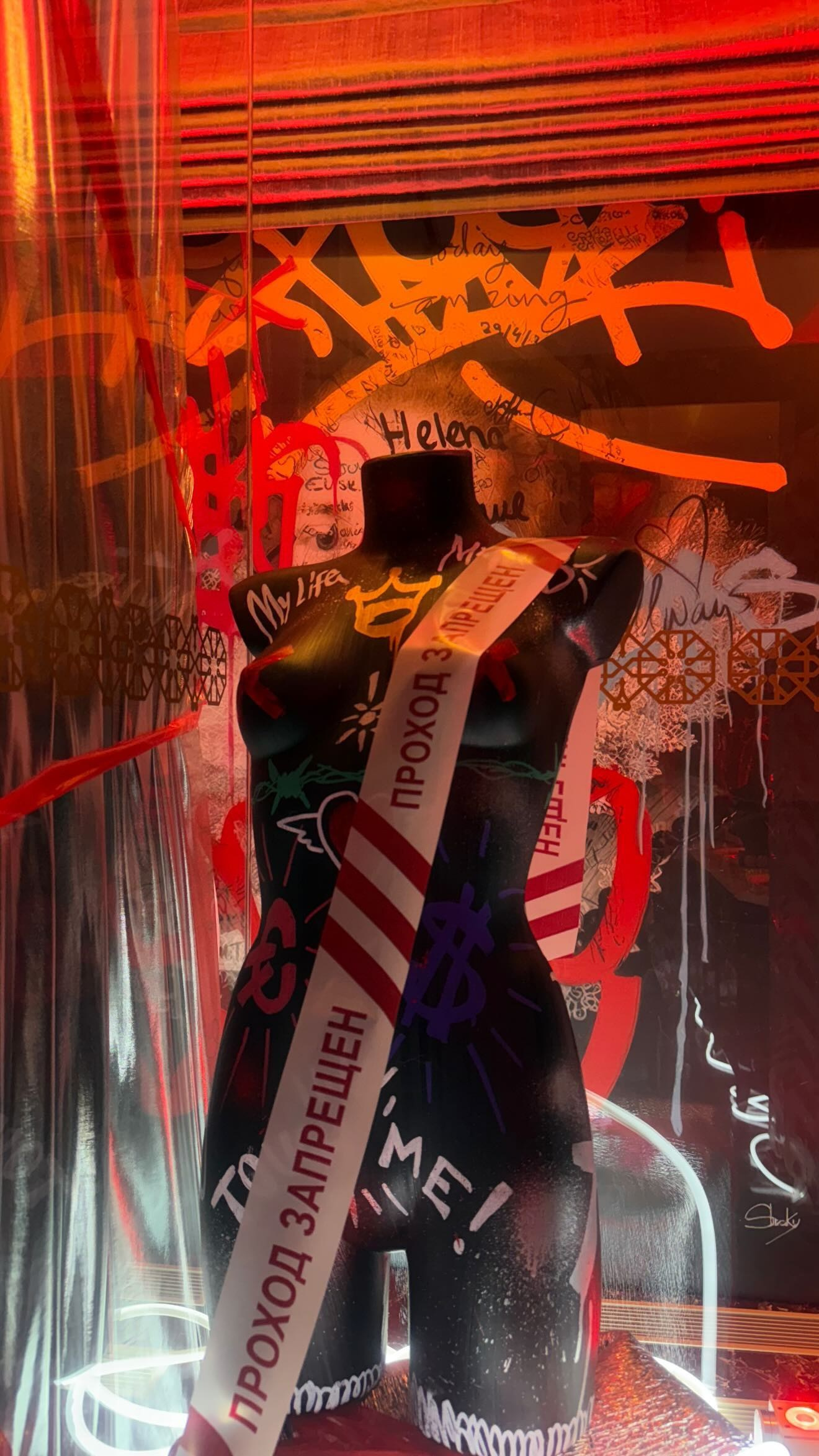 Арт-обьекты покрытые тегами и граффити, балансируют между классическим искусством и уличным протестом. Манекены с лентами «ПРОХОД ЗАПРЕЩЕН» подчеркивают атмосферу закрытого клуба, где нет границ и правил.