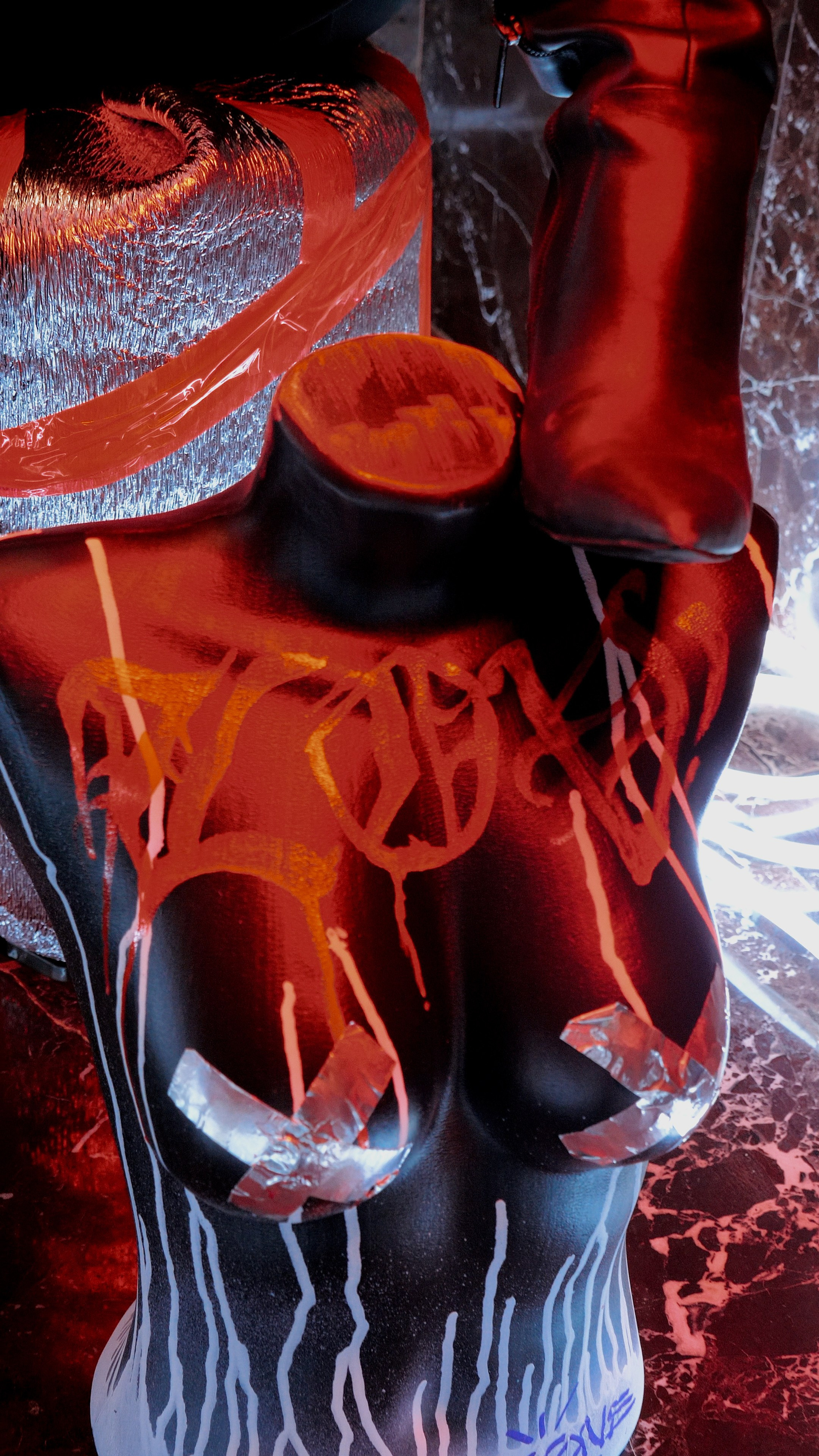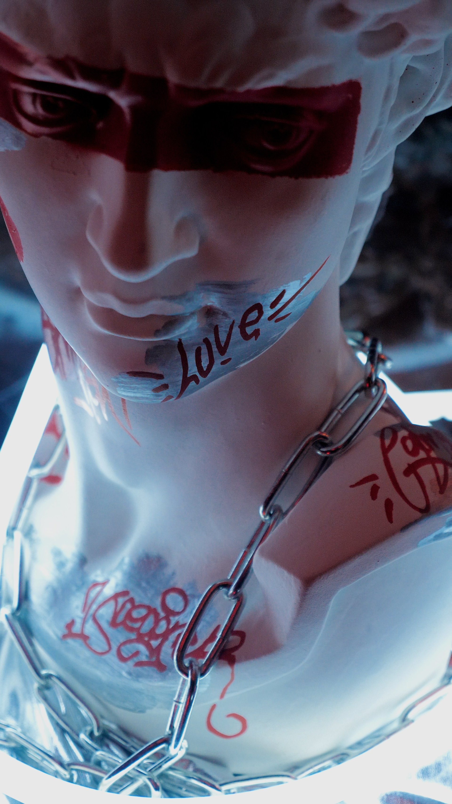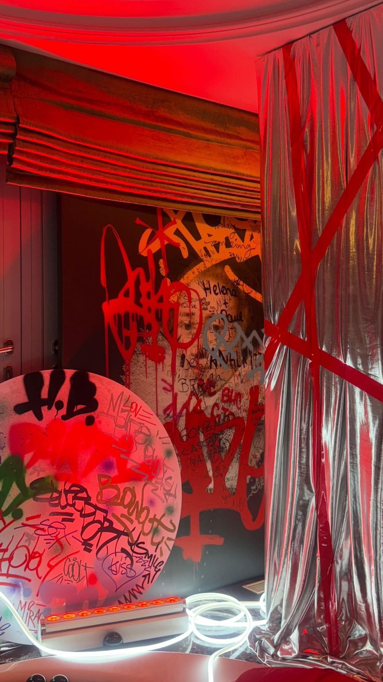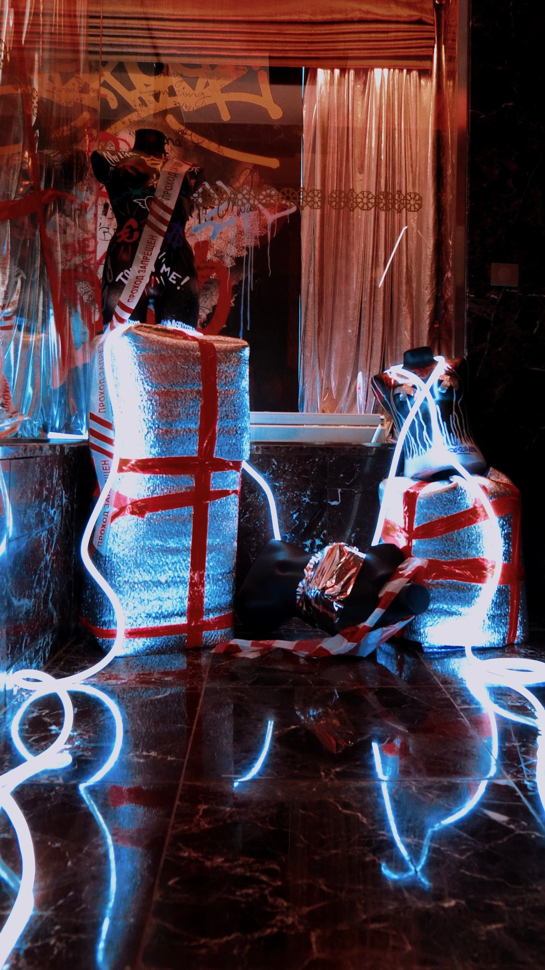 Арт-обьекты покрытые тегами и граффити, балансируют между классическим искусством и уличным протестом. Манекены с лентами «ПРОХОД ЗАПРЕЩЕН» подчеркивают атмосферу закрытого клуба, где нет границ и правил.