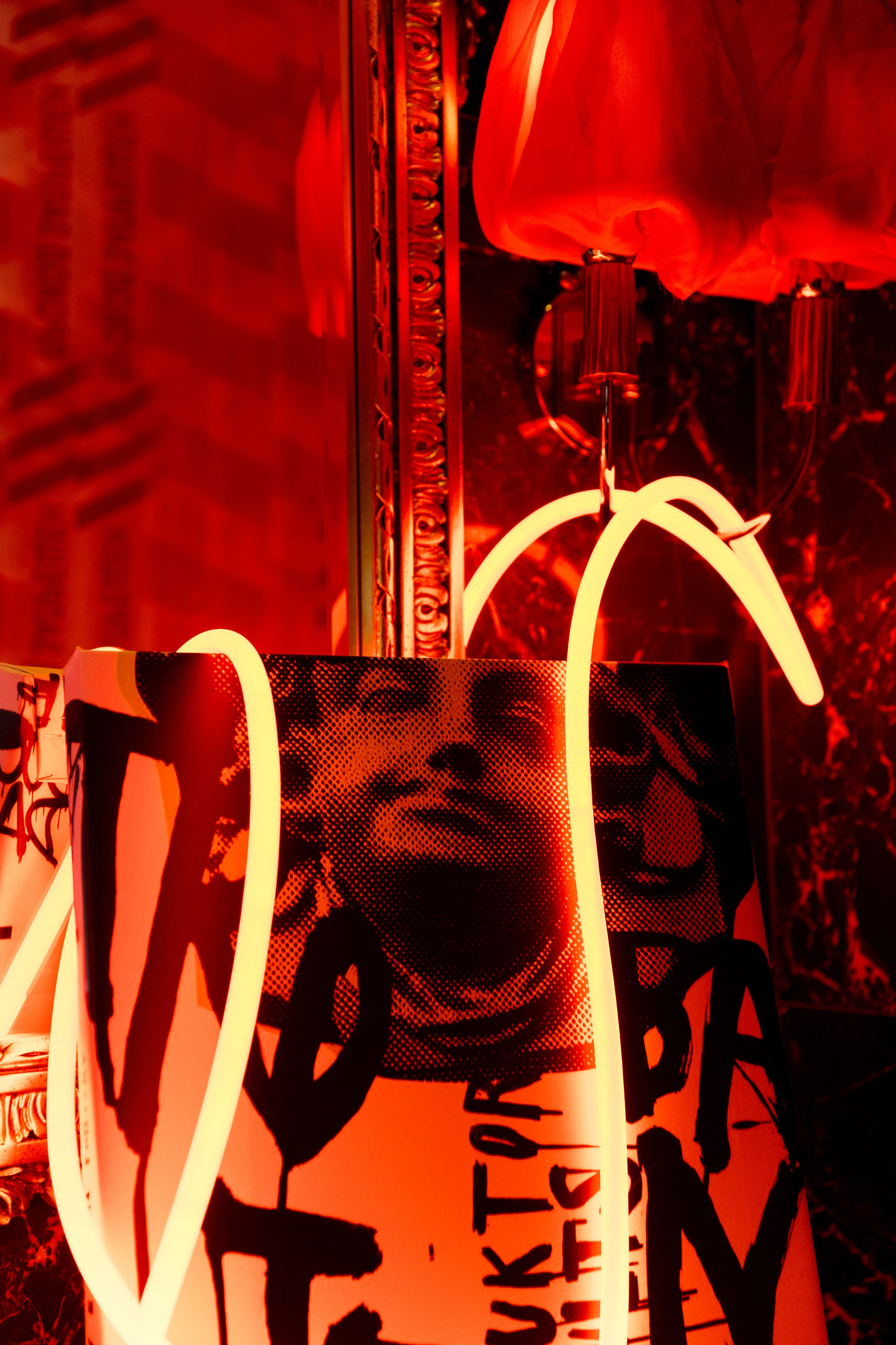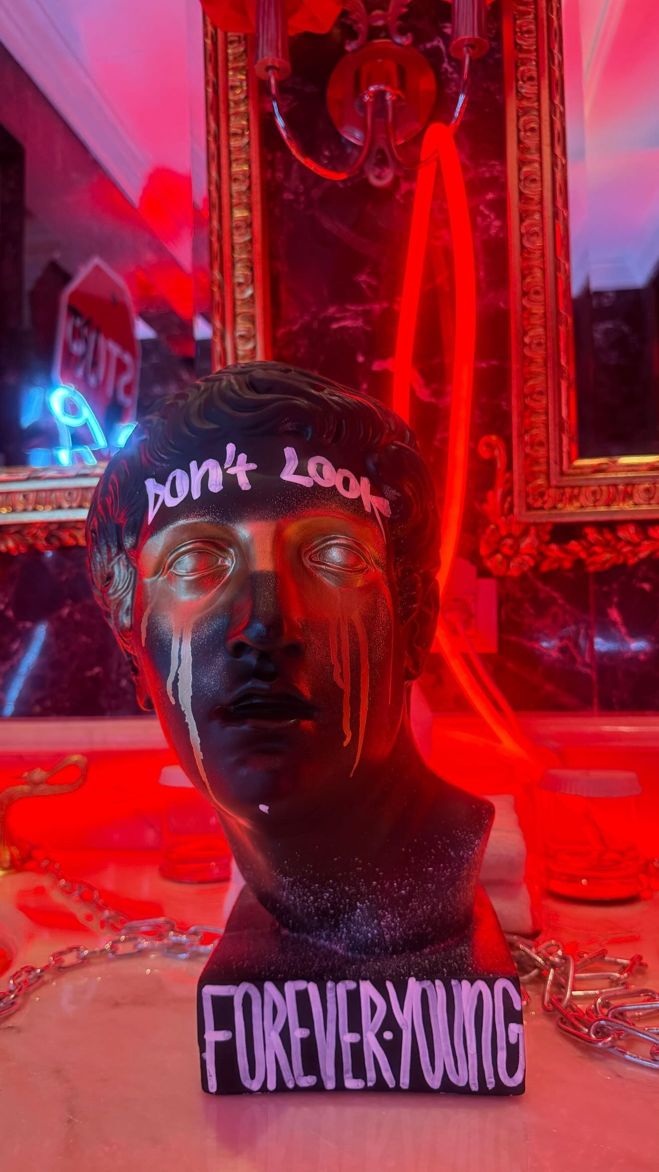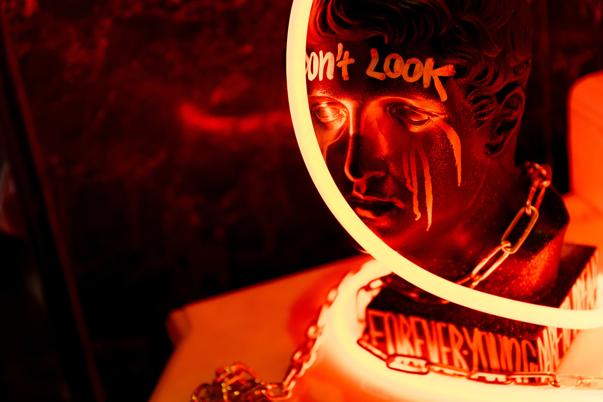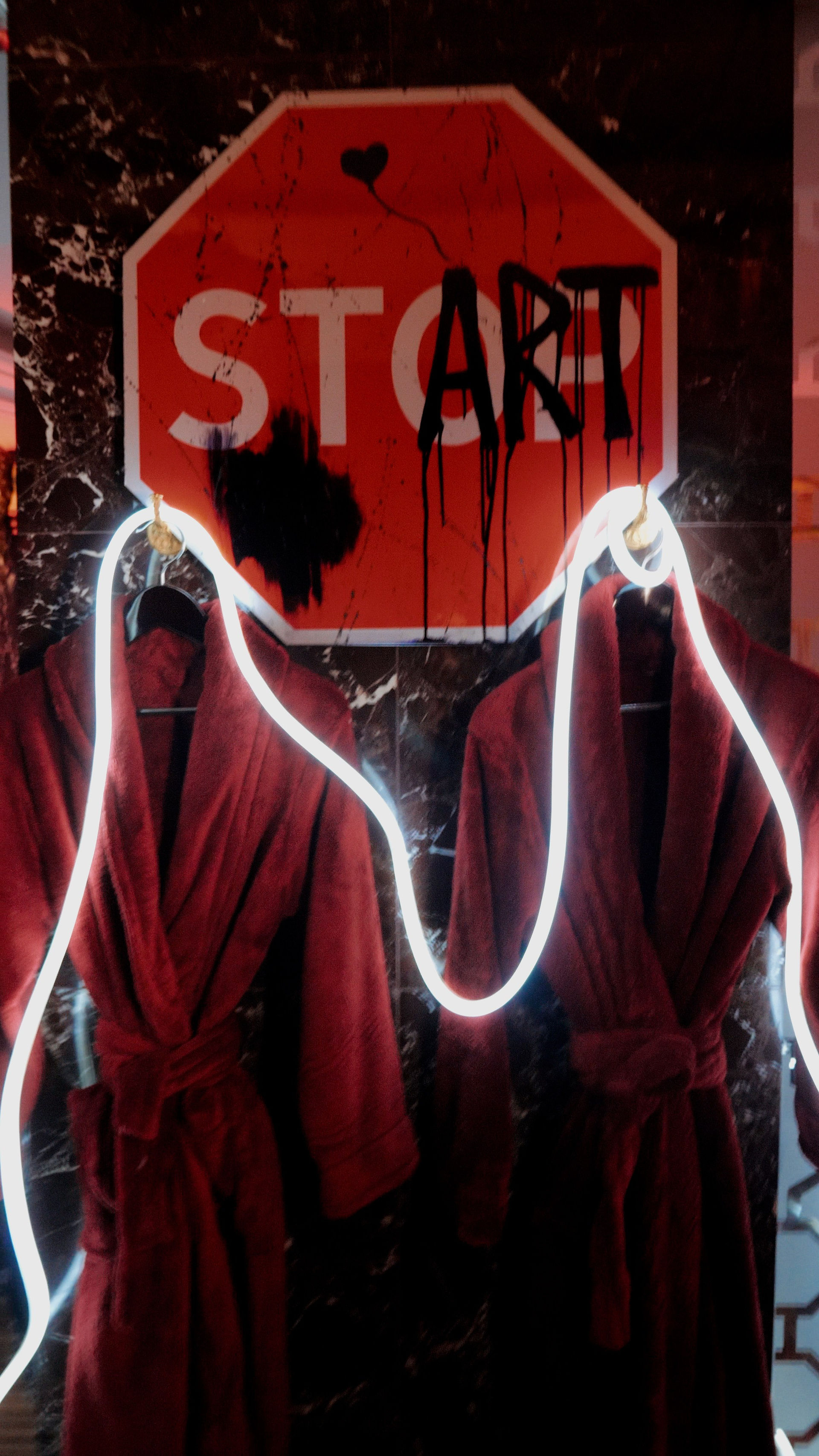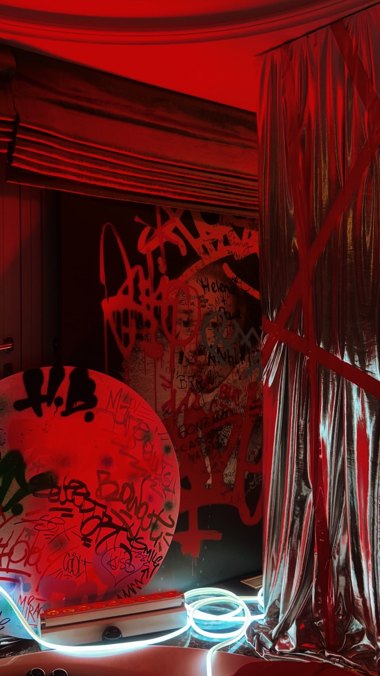 Арт-обьекты покрытые тегами и граффити, балансируют между классическим искусством и уличным протестом. Манекены с лентами «ПРОХОД ЗАПРЕЩЕН» подчеркивают атмосферу закрытого клуба, где нет границ и правил.