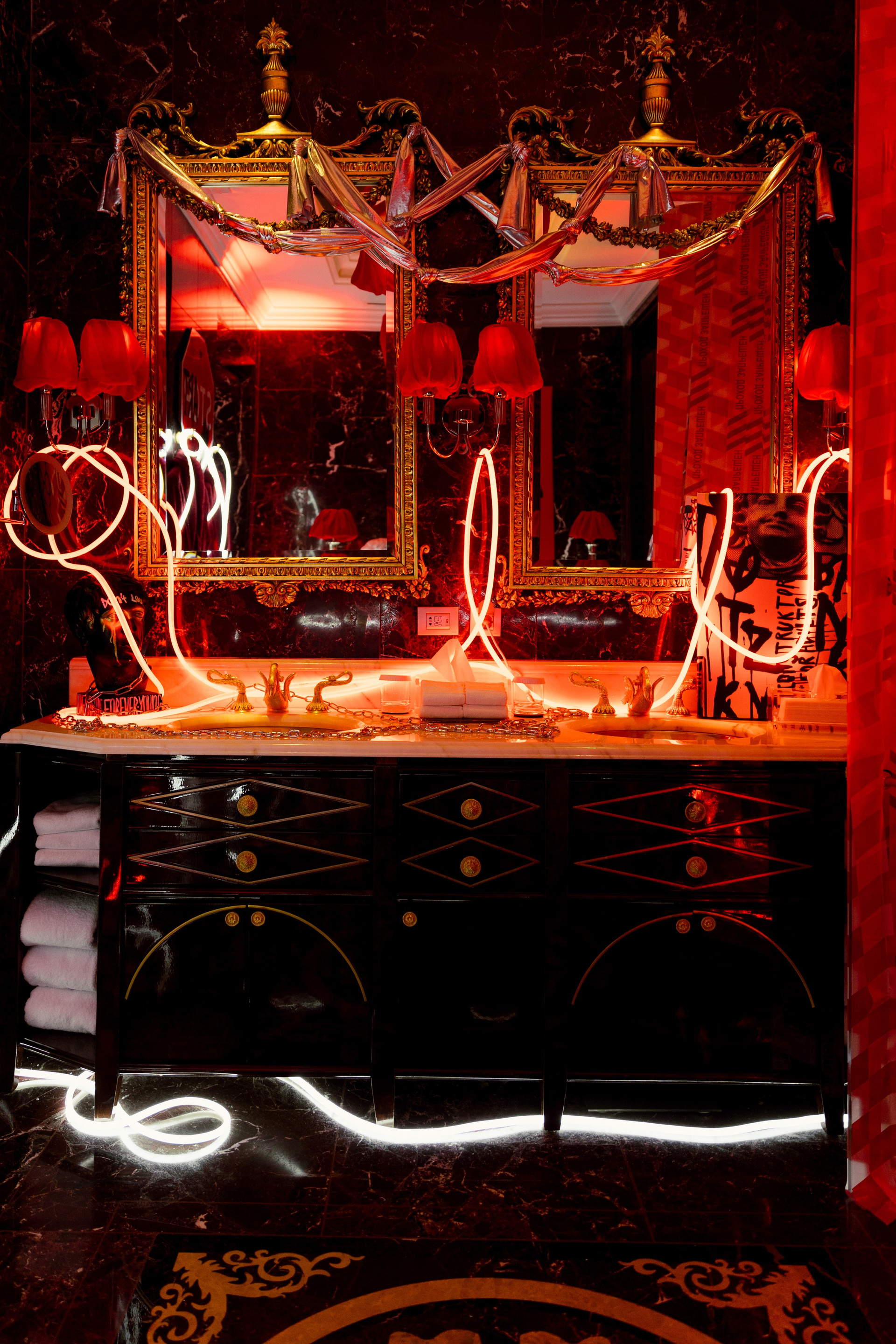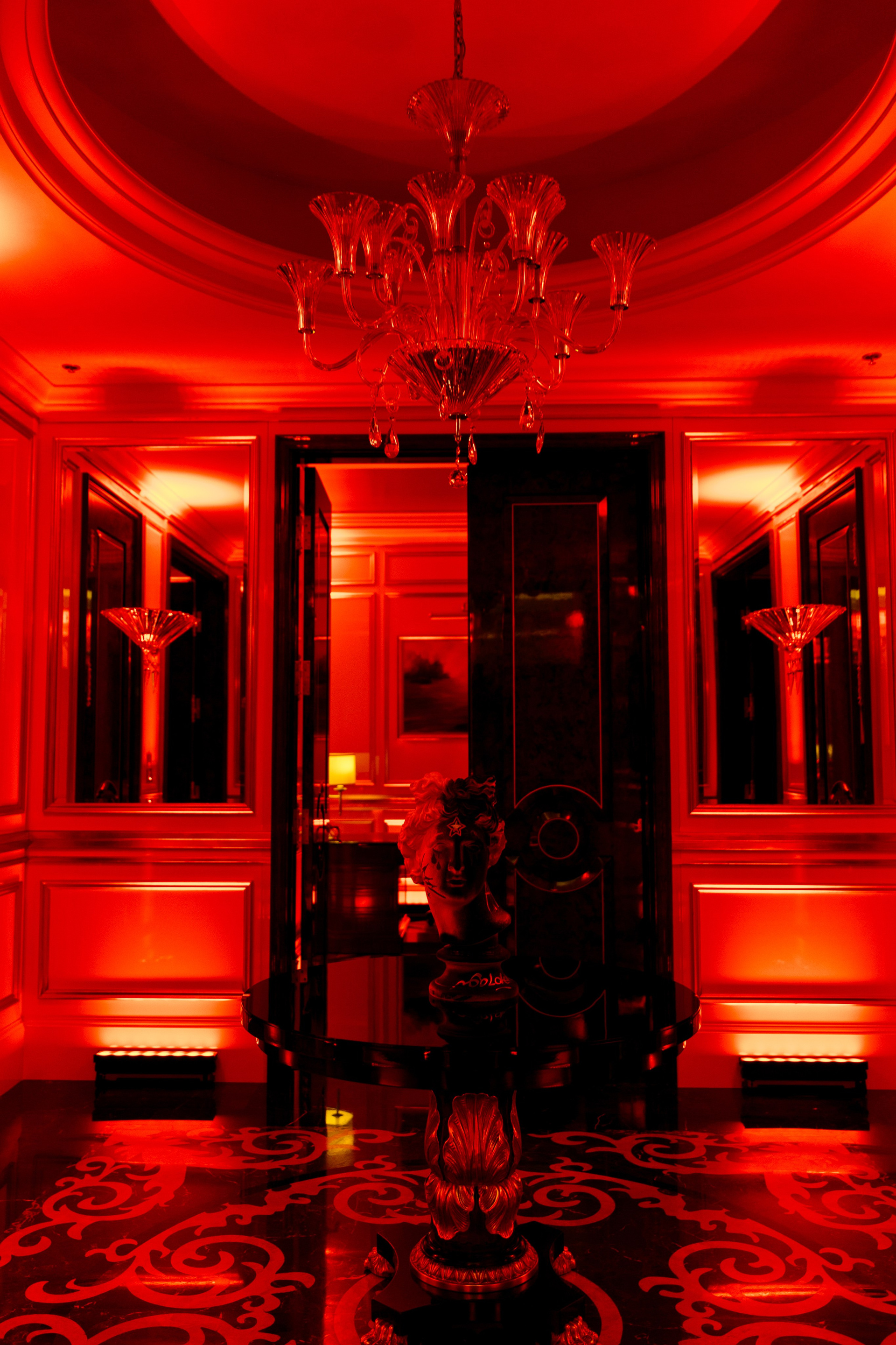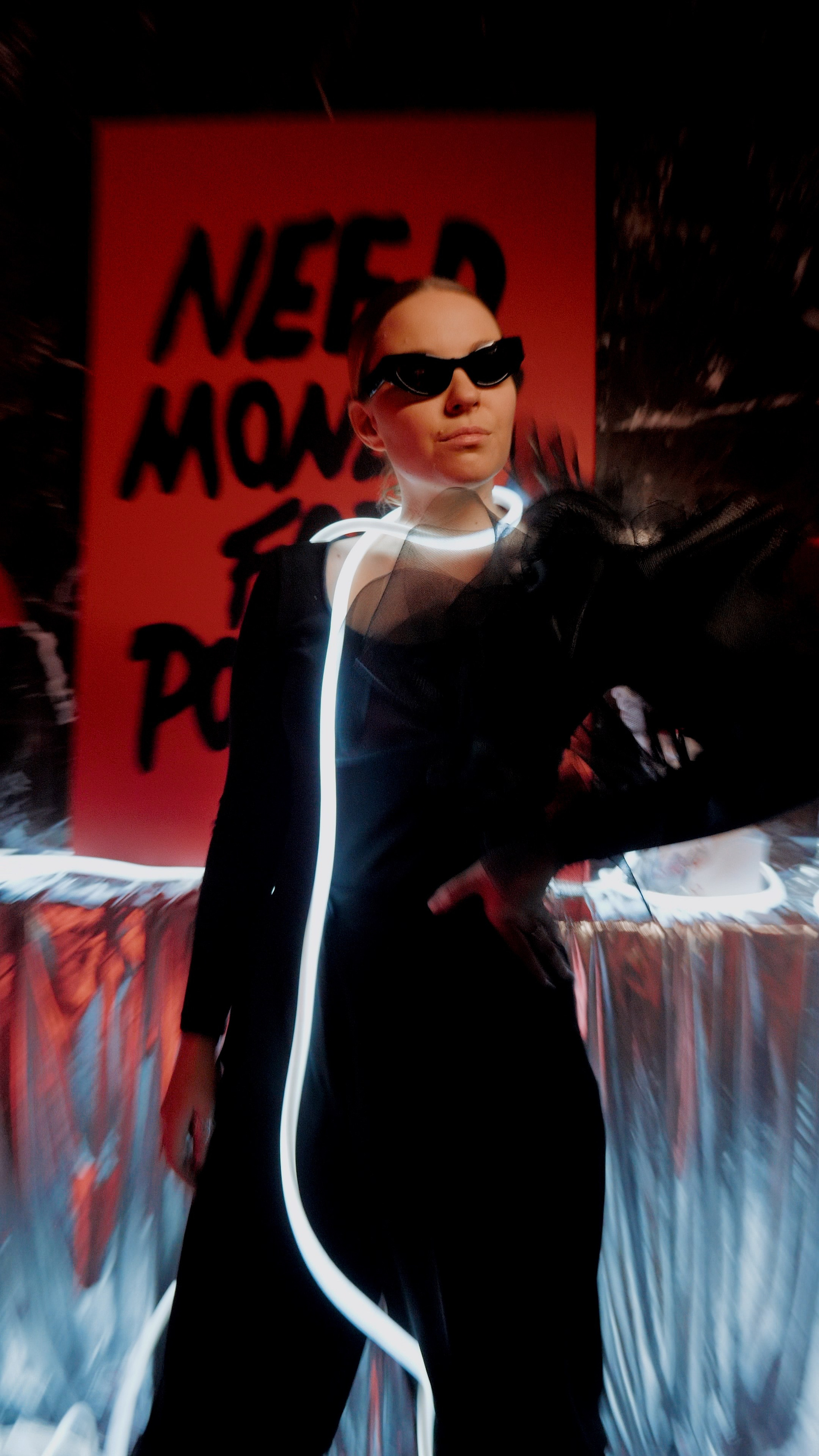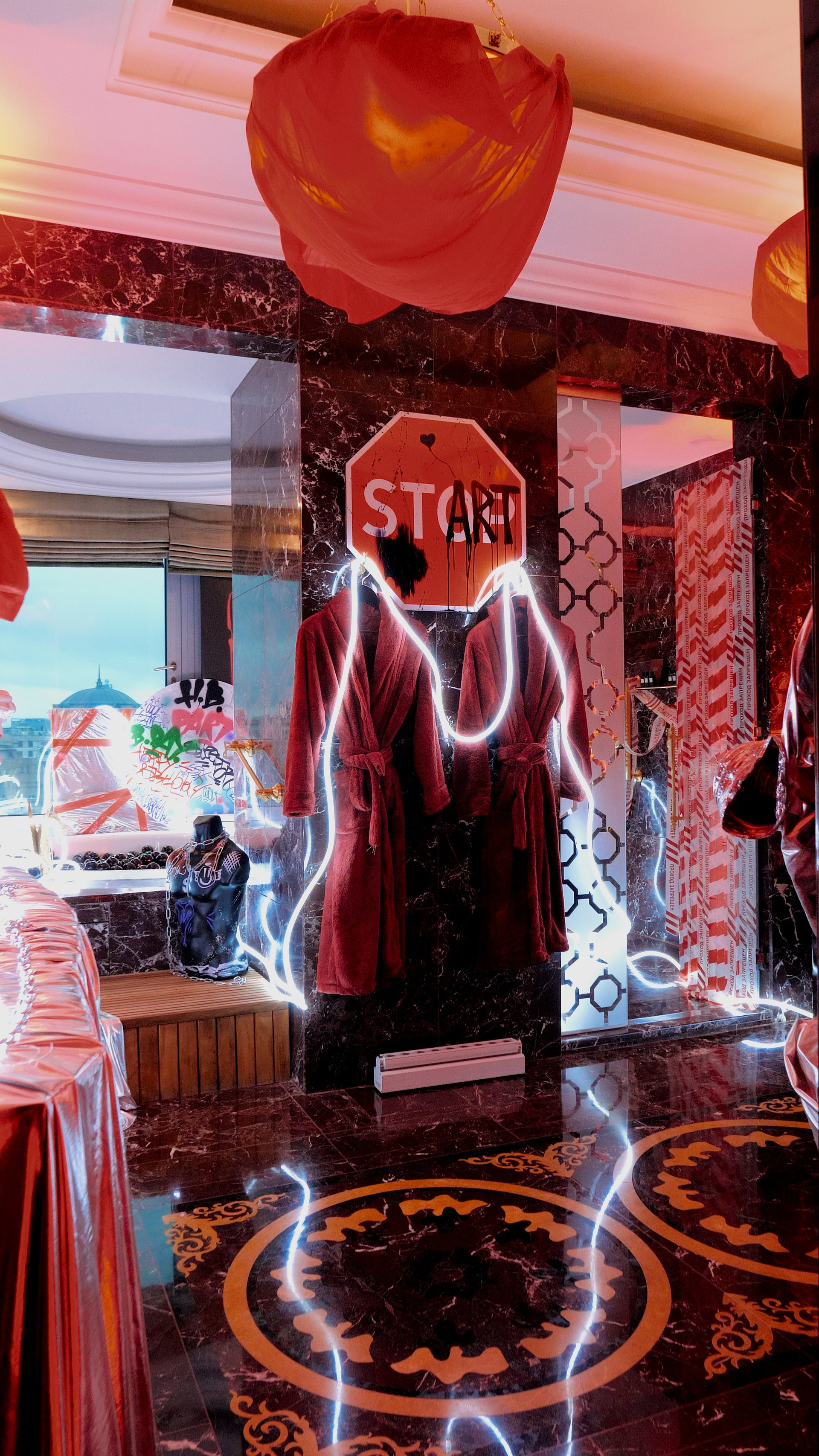Особое внимание — джакузи, наполненный «чёрной икрой», создающий эффект избыточной роскоши и сюрреализма. В сочетании с красным сценическим светом, неоновыми вывесками и металлическими текстурами, преобразует пространство до неузнаваемости. Здесь невозможно просто наблюдать — пространство вовлекает, провоцирует и заставляет запомнить этот вечер навсегда.