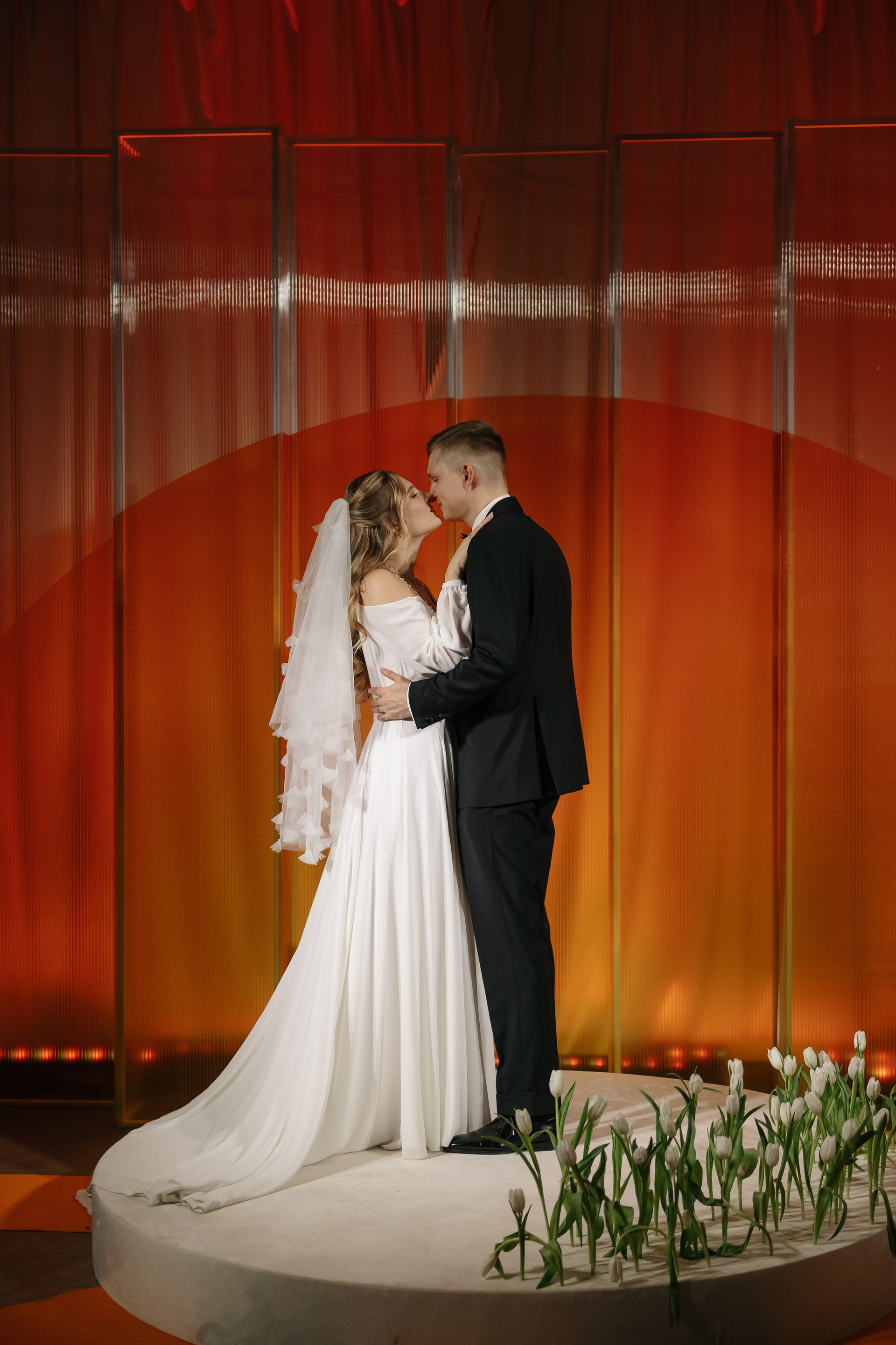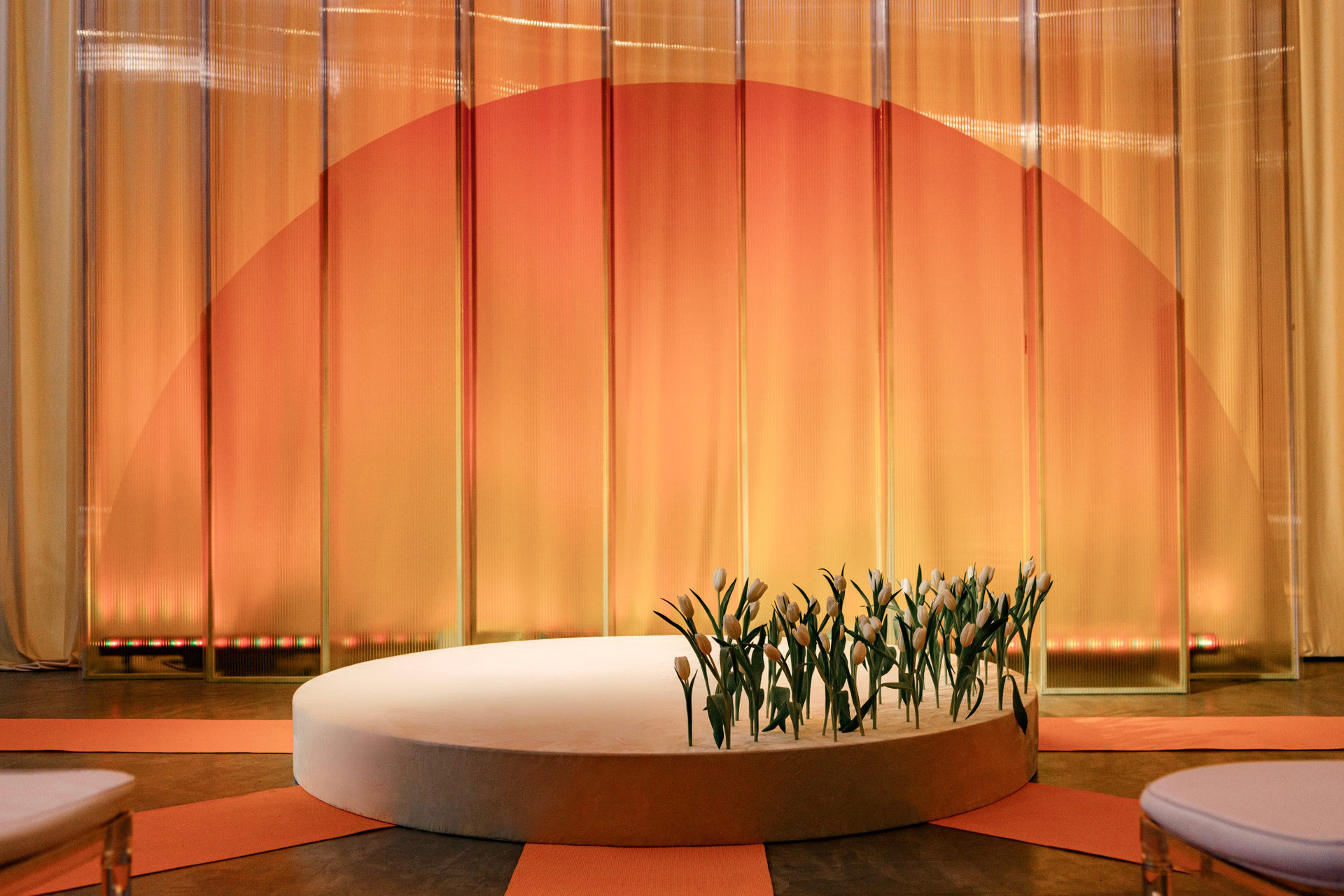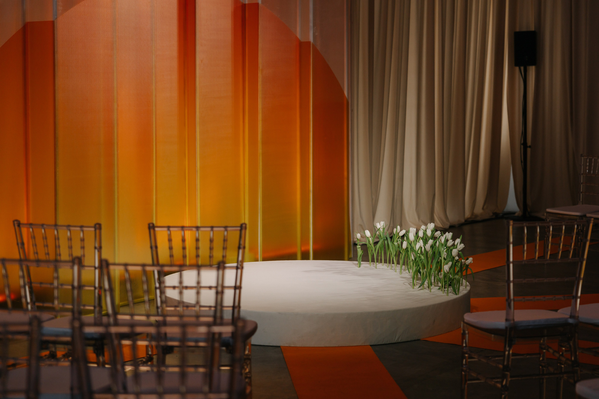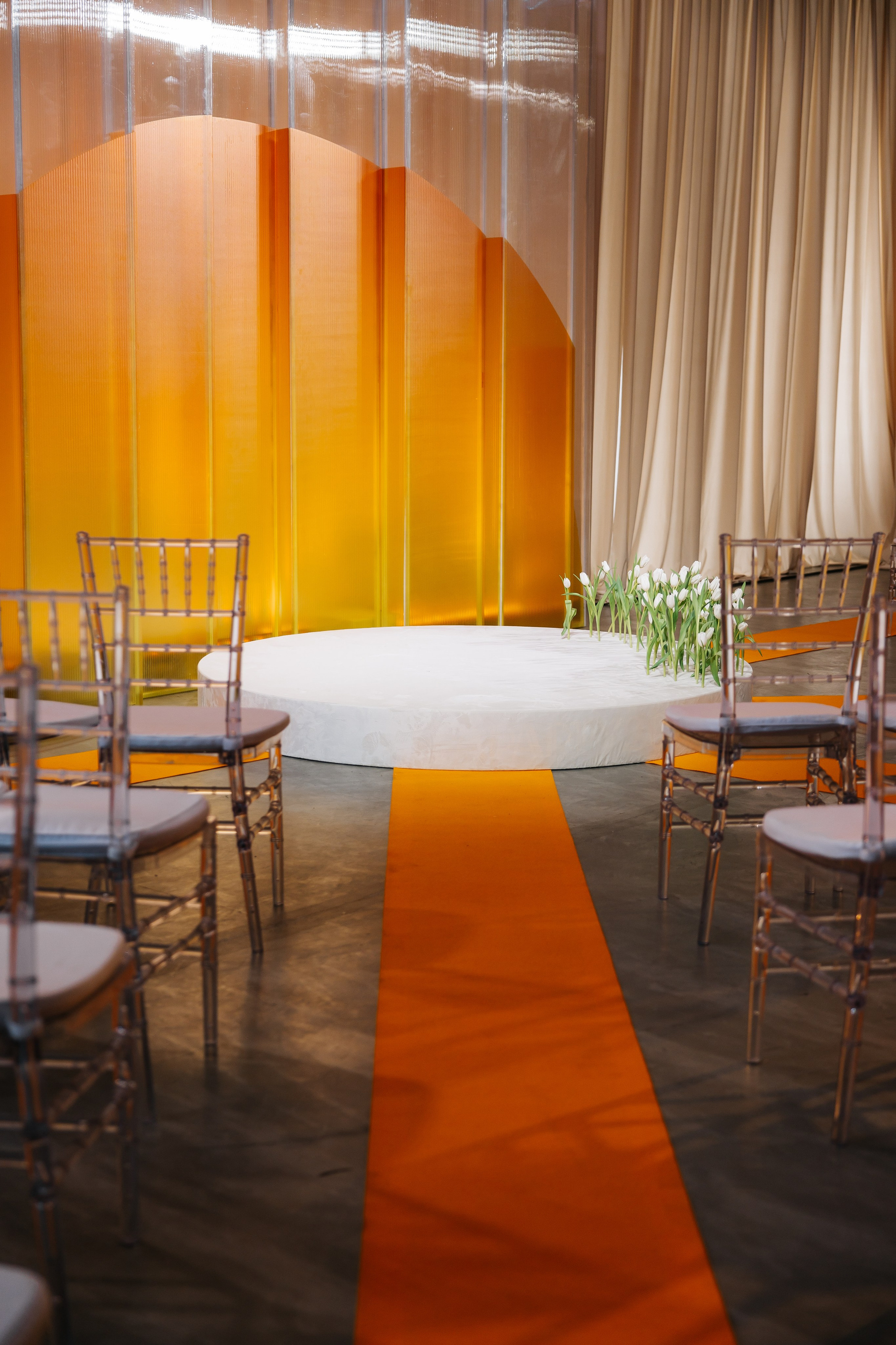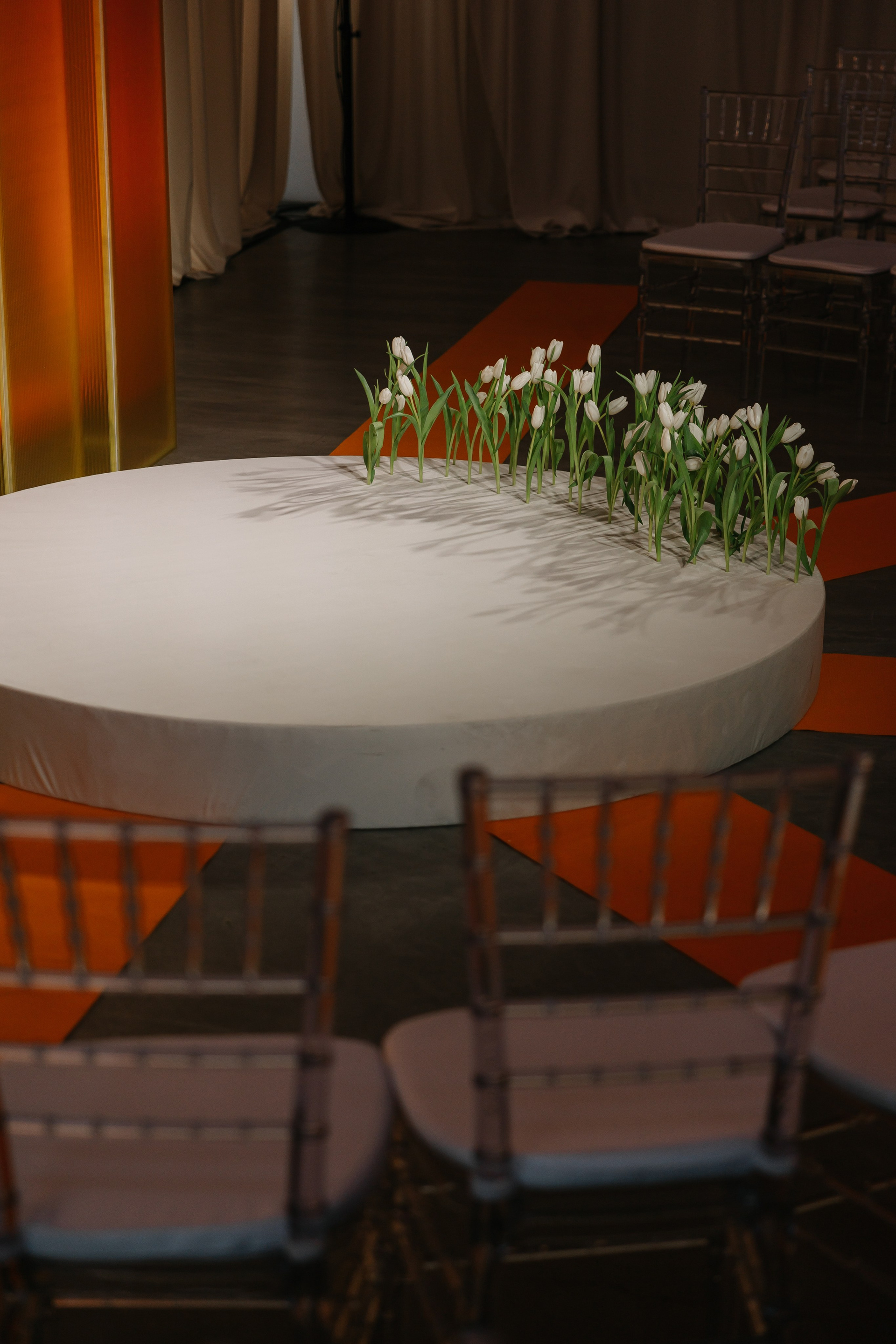 Церемония оформлена поликарбонатной конструкцией в виде восходящего солнца, отражающей легкость первых лучей. Подиум с белыми тюльпанами — символ новой жизни. Гости рассажены лучами, становясь частью рассвета.