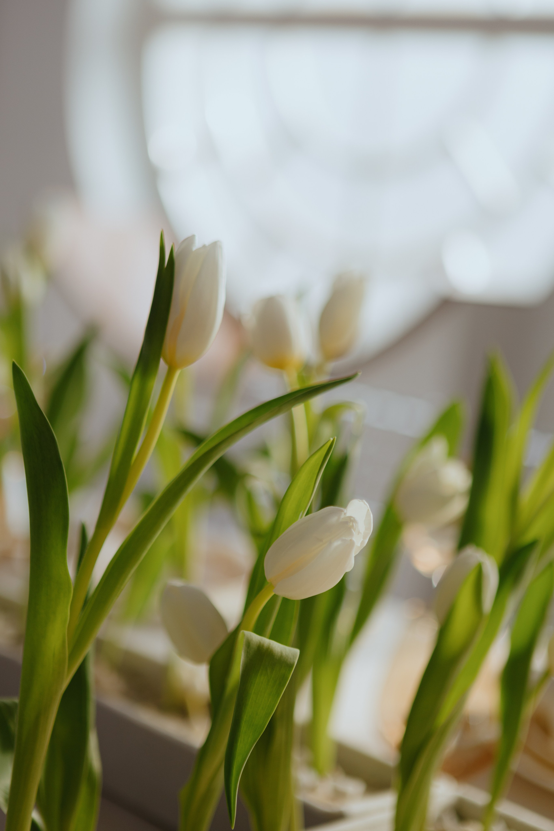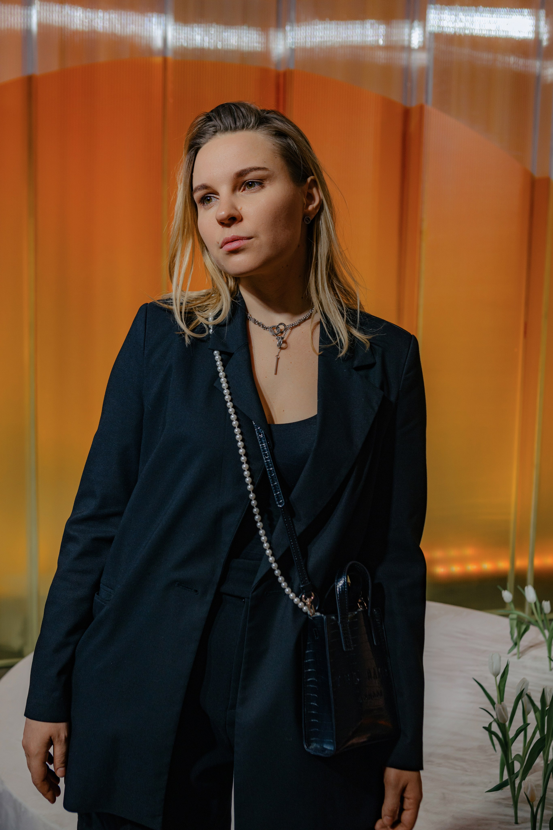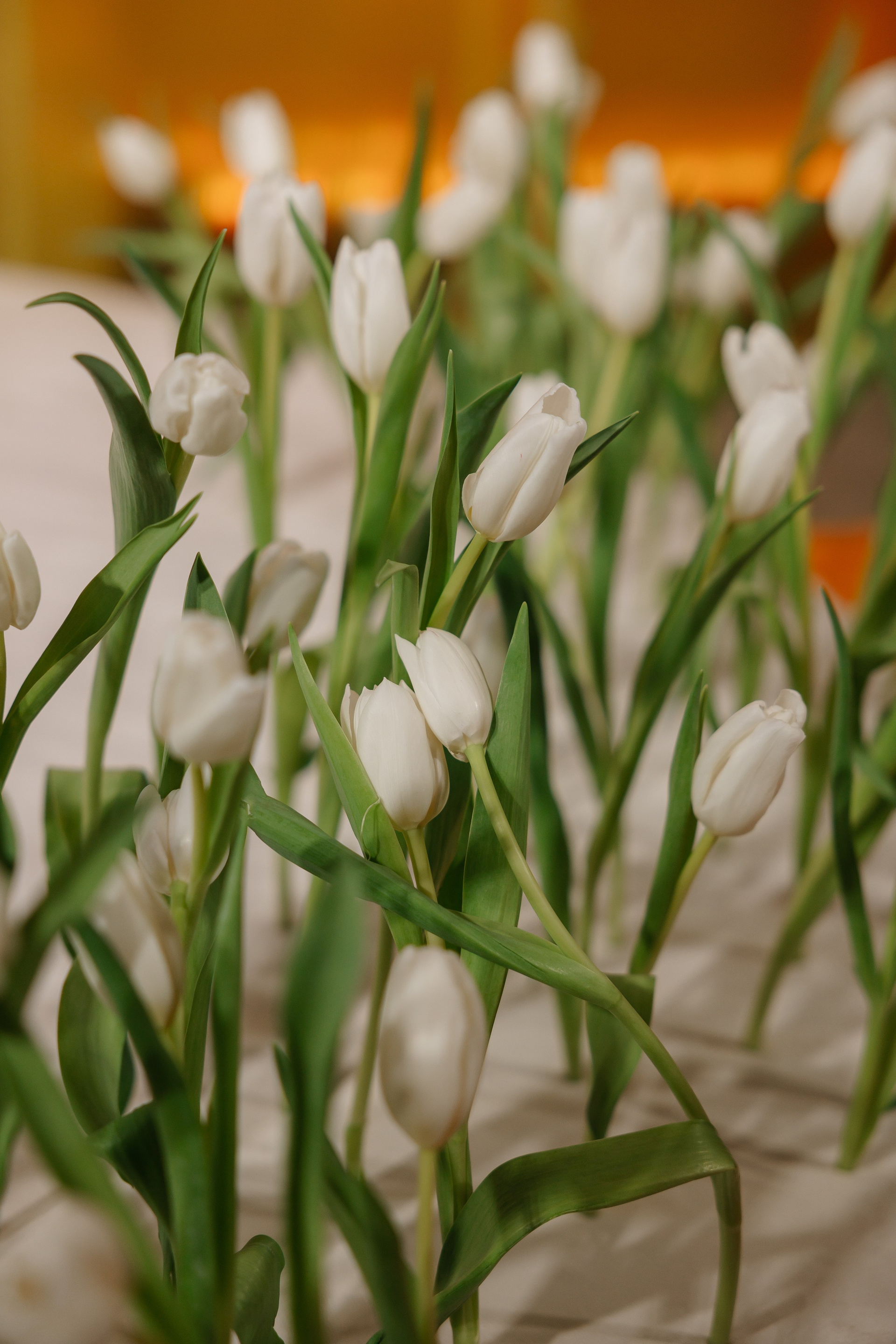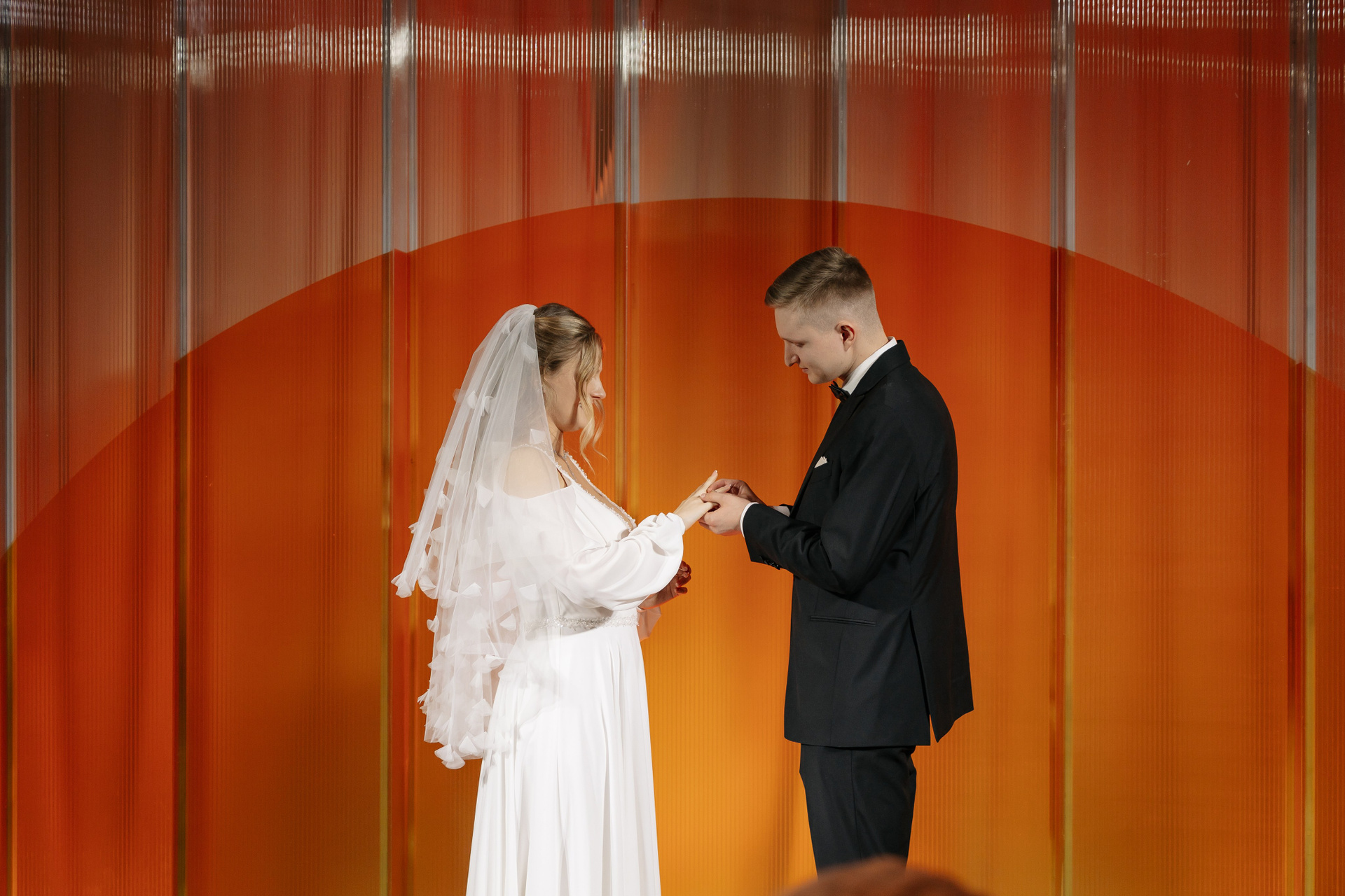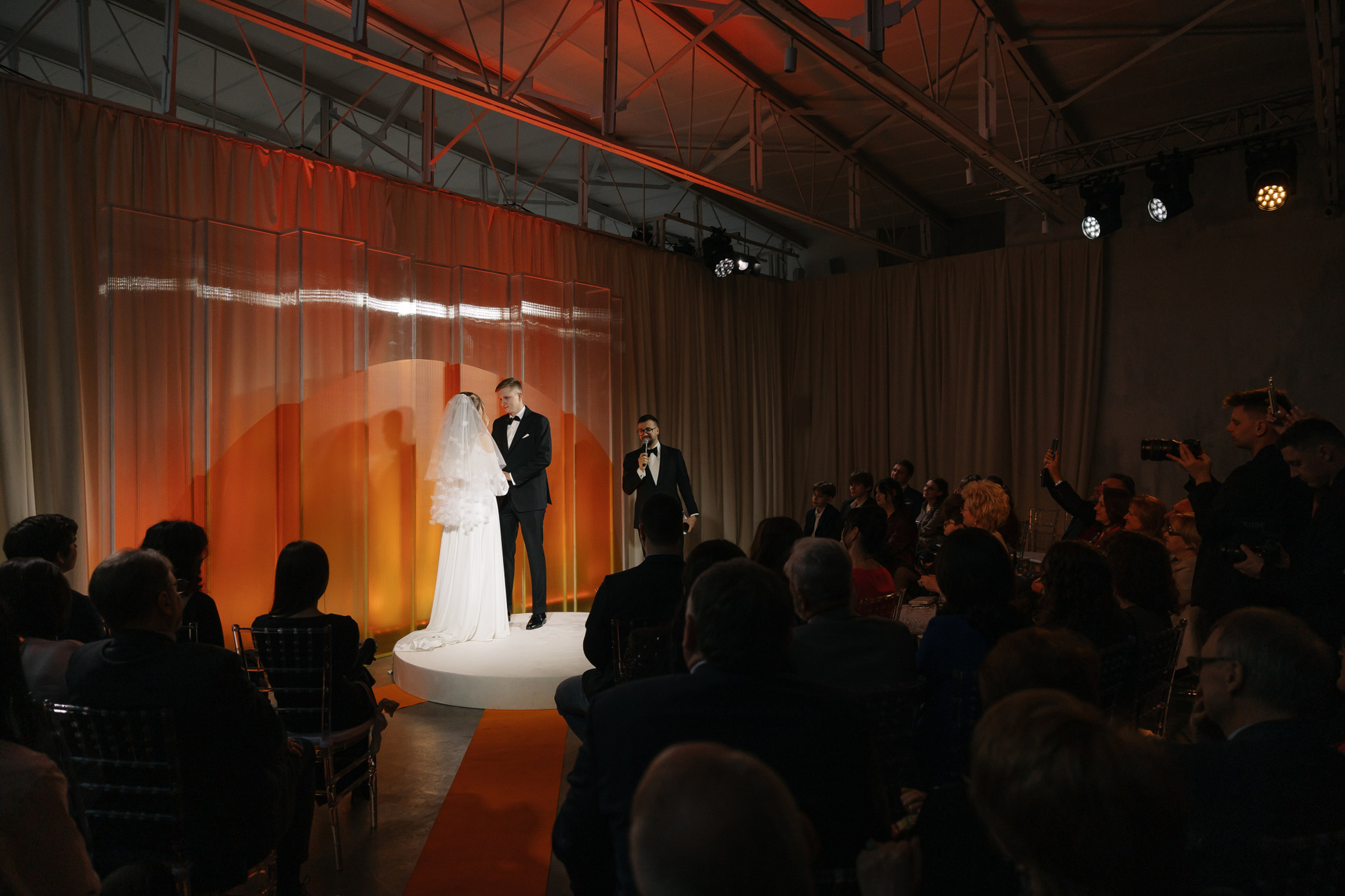 Церемония оформлена поликарбонатной конструкцией в виде восходящего солнца, отражающей легкость первых лучей. Подиум с белыми тюльпанами — символ новой жизни. Гости рассажены лучами, становясь частью рассвета.