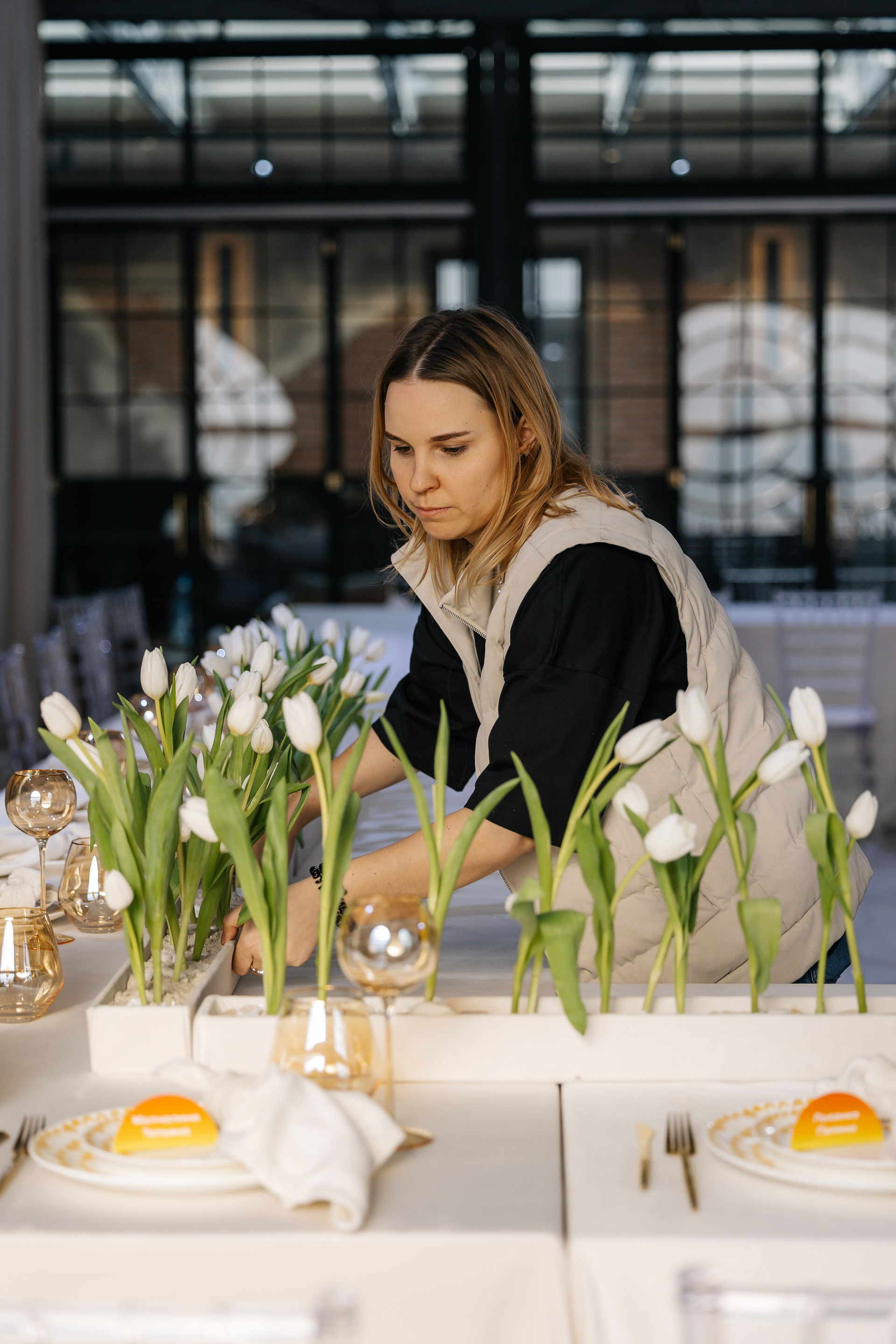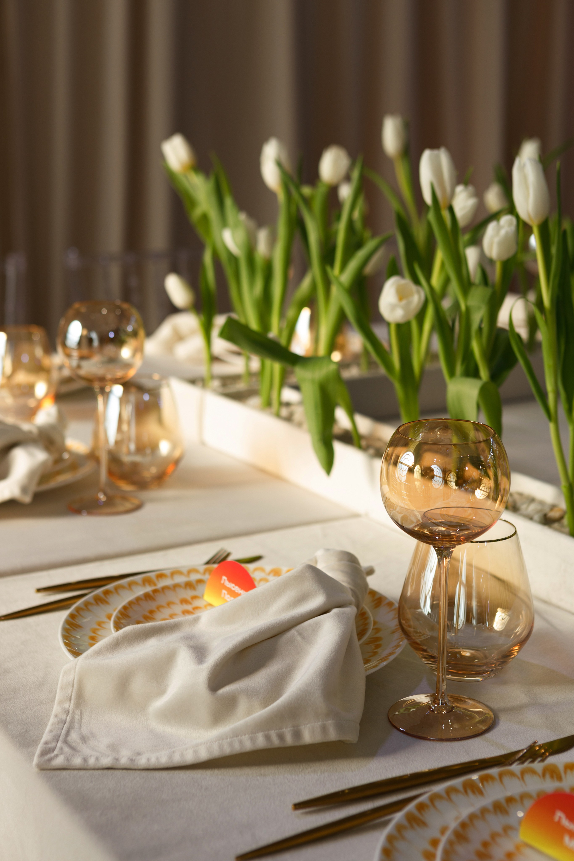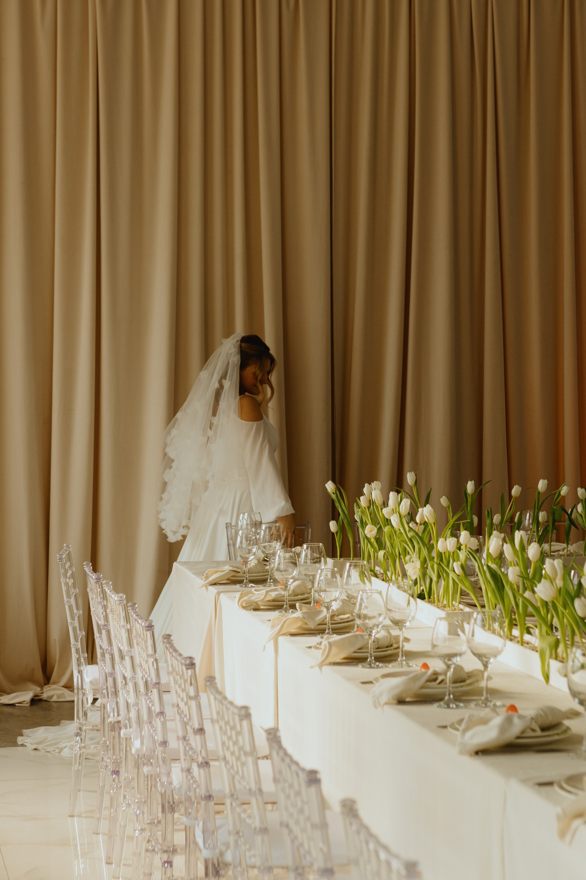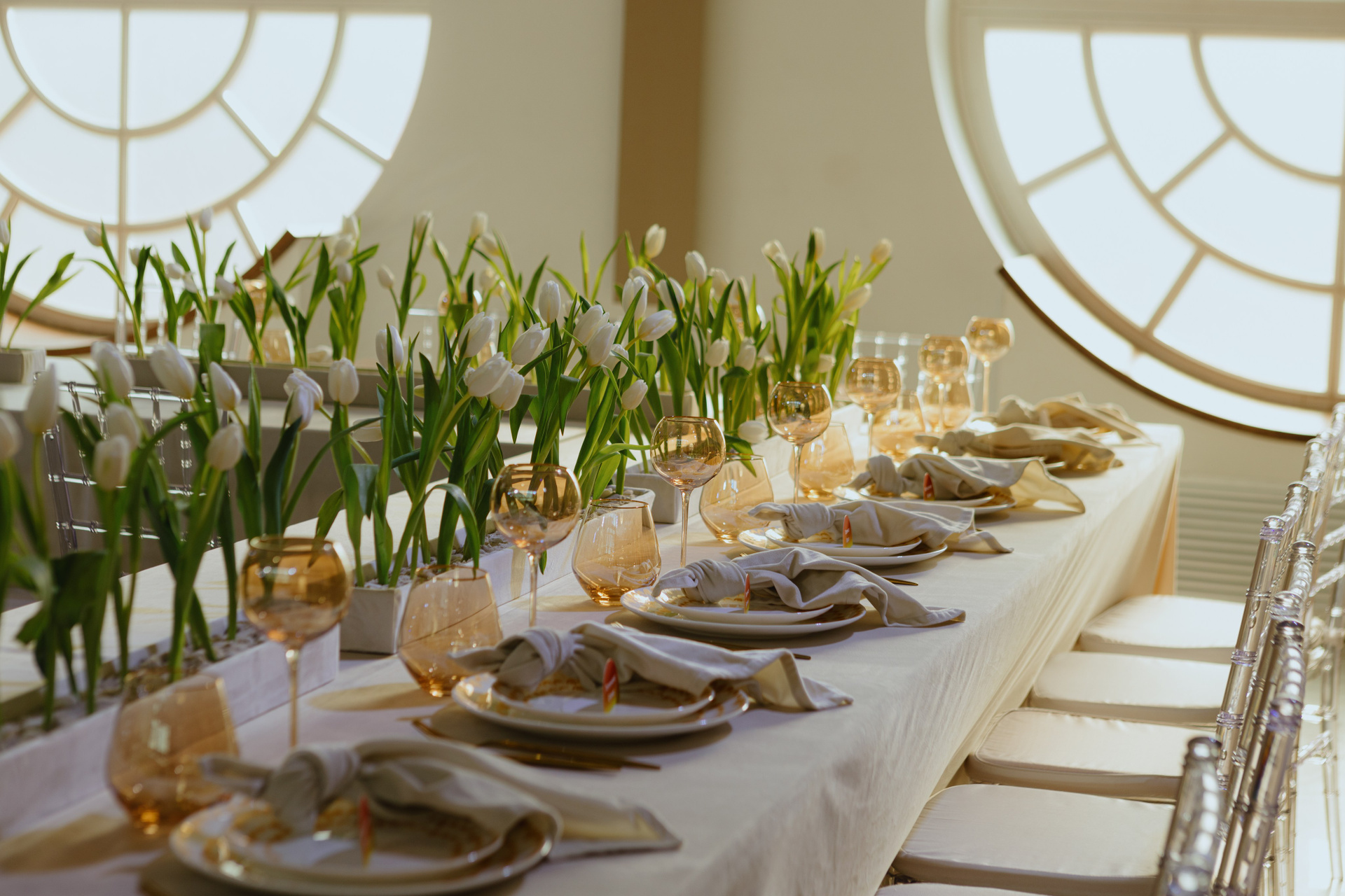 Банкетный зал с П-образная рассадка напоминает аудиторию МГУ, место знакомства пары. Клумбы с белыми тюльпанами, вдохновленные клумбами перед университетом, создают эффект сада. Бежево-золотистая сервировка перекликается с утренним светом.